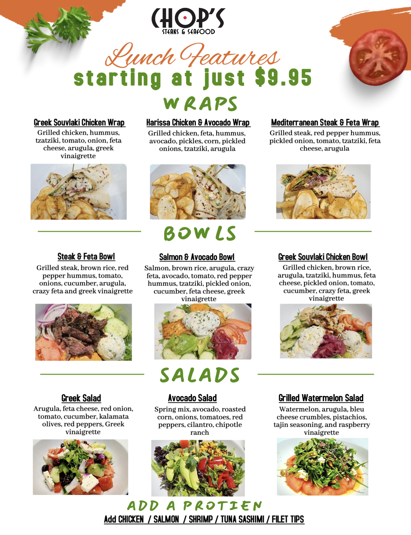 Chop’s lunch menu consists of gourmet sandwiches, soups, specialty salads and steaks & seafood. We are open for lunch weekdays from 11am – 2pm.